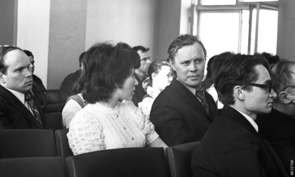 1969 год. В конференц-зале Института физики Сибирского отделения Академии наук СССР (ИФ СО АН СССР), на одном из общеинститутских философских семинаров. В первом ряду Шабанов В. Ф., во втором ряду Хрусталева Л. М., Хрусталев Б. П., в третьем ряду слева Абросов Н. С. Красноярск.