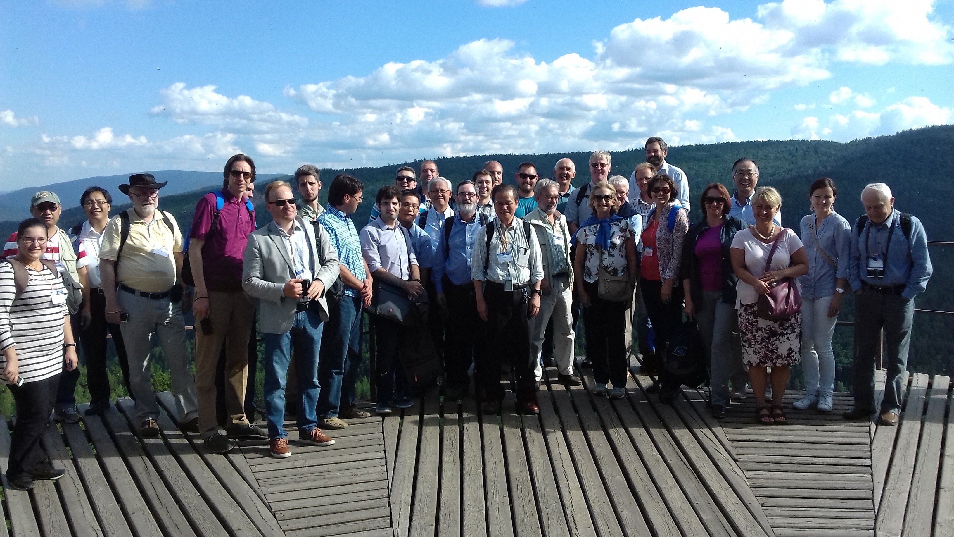 Группа иностранных участников Евро-Азиатского симпозиума "Прогресс в магнетизме" (EASTMAG-2016) в Красноярске во время экскурсии в окрестности Красноярска. Бобровый Лог. 18 августа 2016 года.