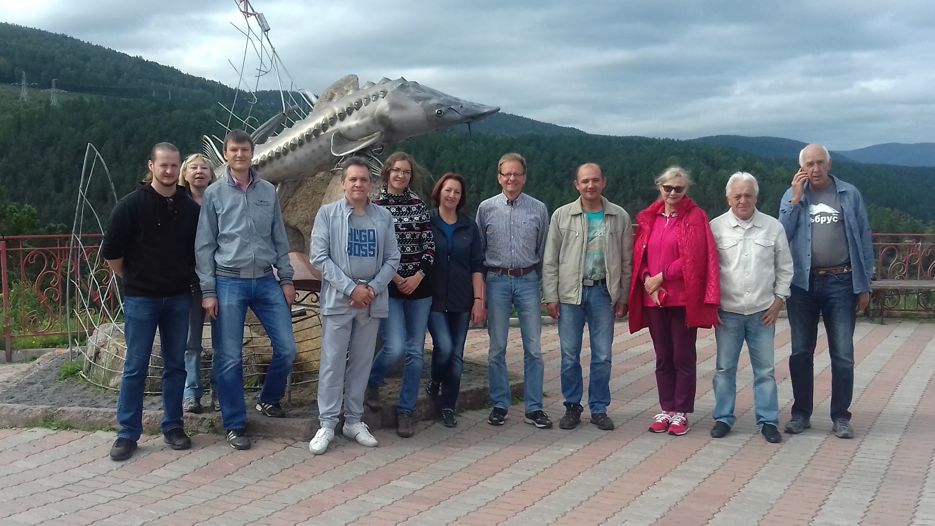 Смотровая площадка. "Царь-рыба". (Поселок Слизнево под Красноярском). Участники международного рабочего совещания по квантовой наноспинтронике, (21−23 августа 2016 г., Красноярск) , слева направо: Дмитрий Смоляков, Ольга Бруштунова, Евгений Ерёмин, Никита Волков, Наталья Гребенникова, Елена Бондарева ( сотрудники Института физики им. Л.В. Киренского Сибирского отделения Российской академии наук - ИФ СО РАН), Даниэль Бюрглер (Юлихский исследовательский центр, Германия), Сергей Попков (ИФ СО РАН), Тамара Овчинникова (Институт леса Сибирского отделения Российской академии наук - ИЛ СО РАН), Владимир Устинов (ИФМ УрО РАН) и Сергей Овчинников (Институт физики СО РАН).