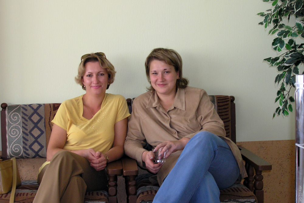 2011 год. Бондарева Е.В. и Болсуновская О.А. (справа), сотрудники Института физики им. Л.В. Киренского Сибирского отделения Российской академии наук (ИФ СО РАН), в холле института, Красноярск.
