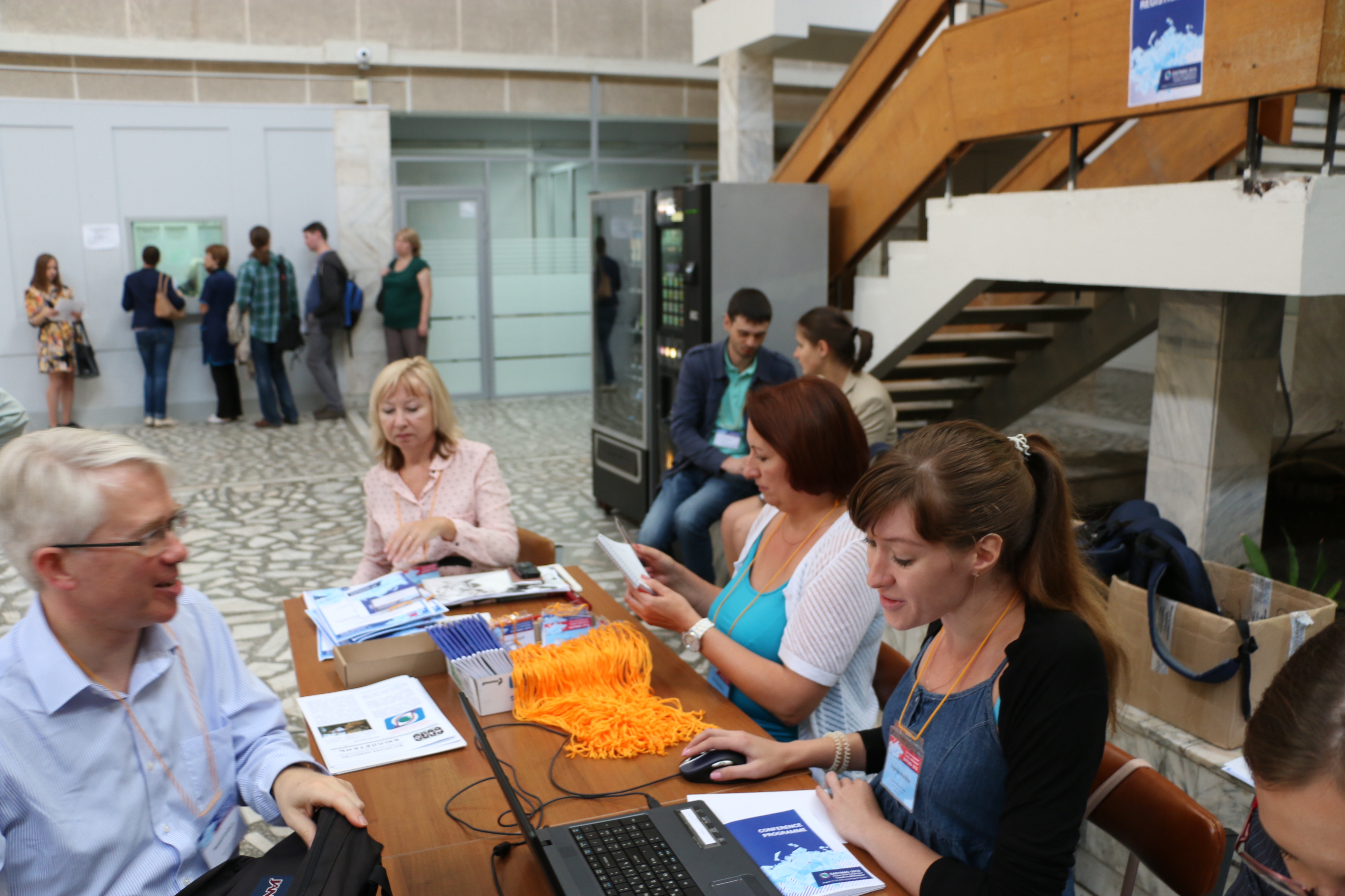 Регистрация участников Евро-Азиатского симпозиума "Прогресс в магнетизме" (EASTMAG-2016), организованного и проведенного в Красноярске в 2016 году. На снимке слева направо: Рассел Каубёрн (Кембридж), Ольга Бруштунова, Елена Бондарева и Евгения Мошкина. Красноярск.