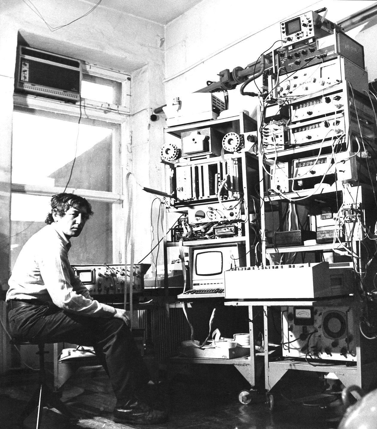 В лаборатории сильных магнитных полей Института физики им. Л.В. Киренского Сибирского отделения АН СССР велись работы по созданию установок стационарных и импульсных магнитных полей, разрабатывались методы измерений в сильных магнитных полях, велись исследования свойств магнитных материалов в таких полях. На снимке:1985 год. Бояршинов Ю.В., ведущий инженер лаборатории, у автоматизированного магнетометра со сверхпроводящим соленоидом (до 8 Т) для измерения магнитных свойств ферро- антиферро- и диамагнитных веществ. Красноярск.
