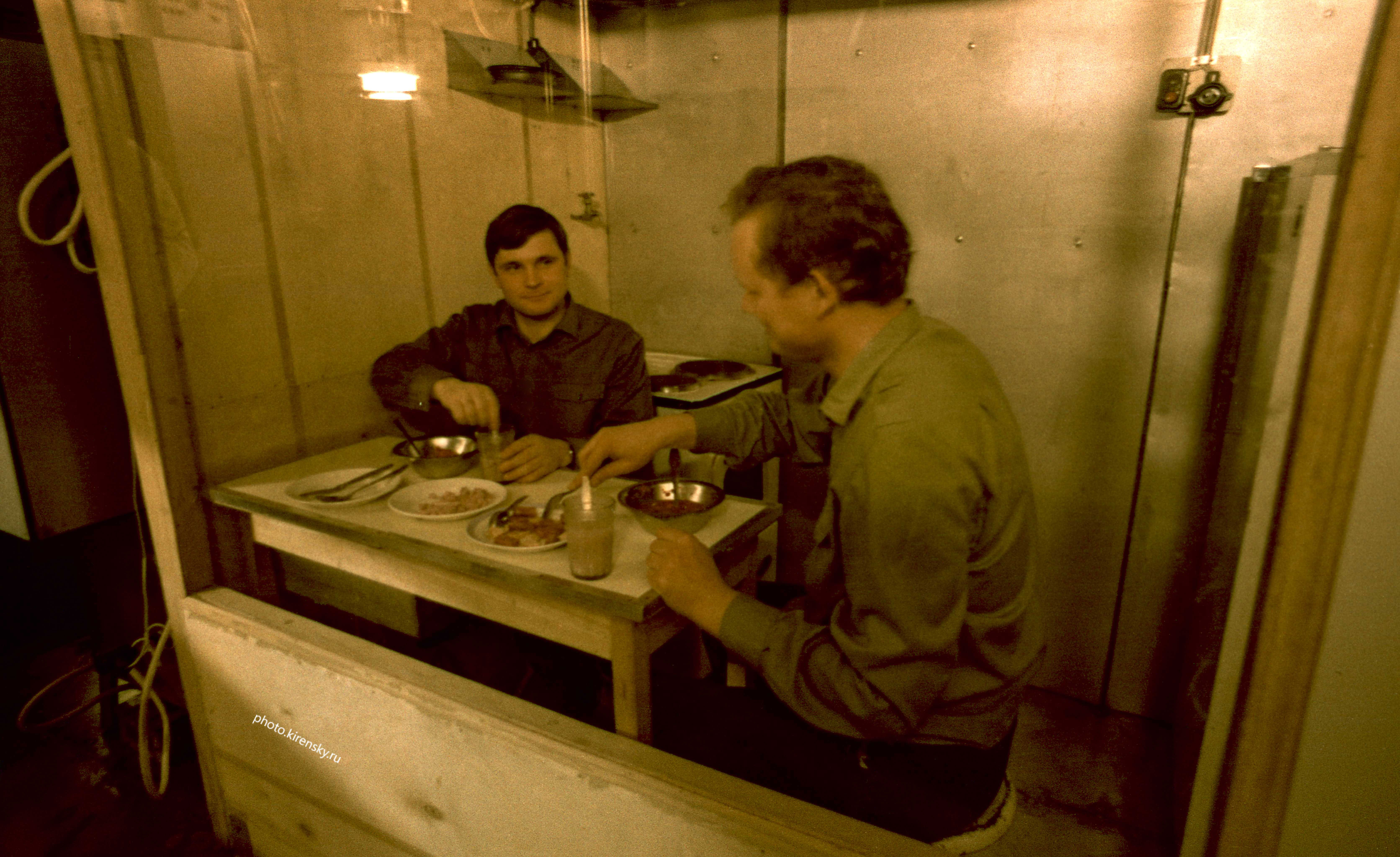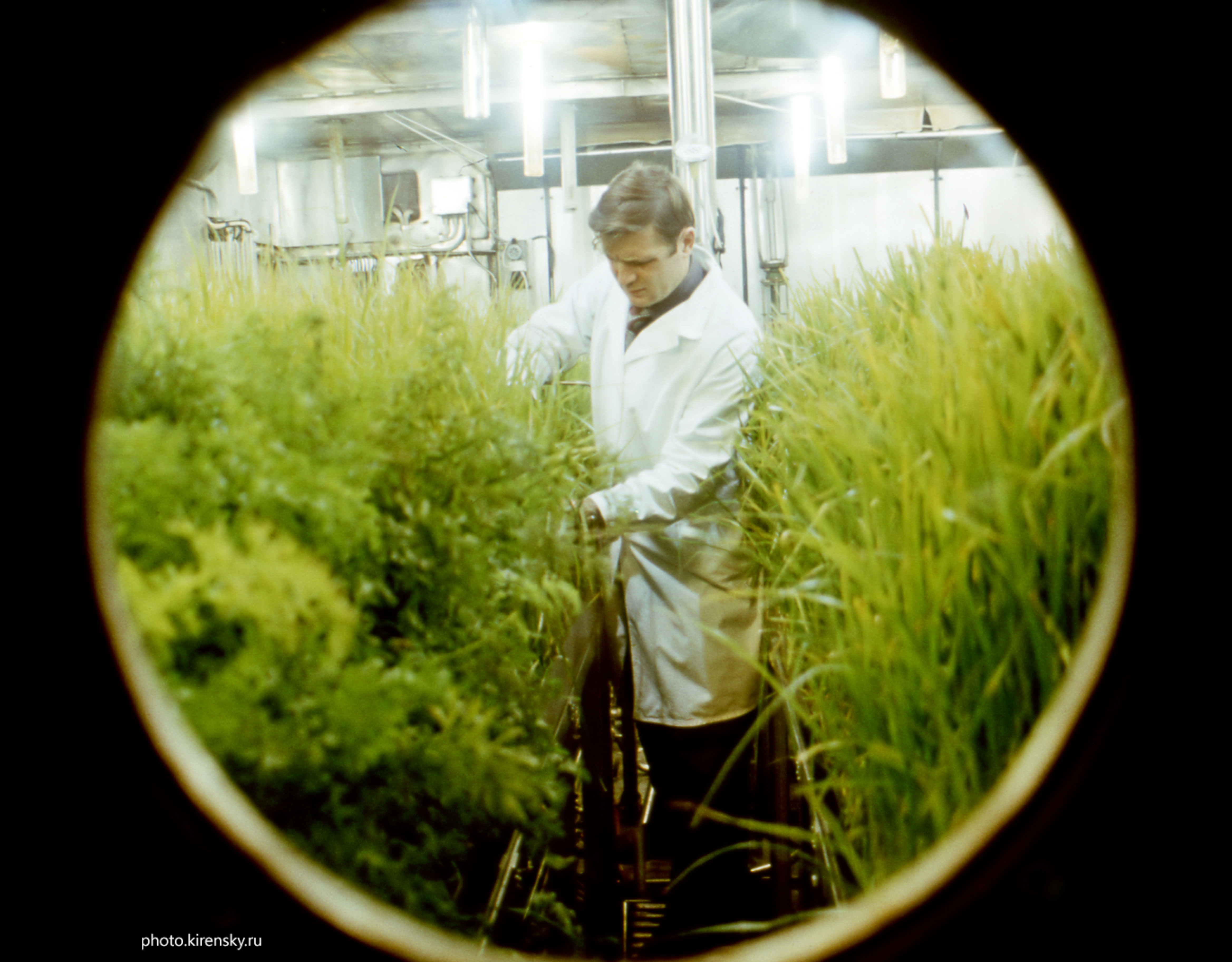 В 1973 году в отделе биофизики Института физики им. Л.В. Киренского Сибирского отделения Академии наук СССР (ИФ СО АН СССР) проведен 6-ти месячный эксперимент в «БИОС-3», в ходе которого экипаж из трех человек был полностью обеспечен кислородом и водой и на 30% пищевыми веществами за счет интенсивного биосинтеза специального набора зерновых и овощных культур. На снимке, участники эксперимента Николай Иванович Бугреев (слева) и Николай Иванович Петров во время завтрака. Красноярск.
