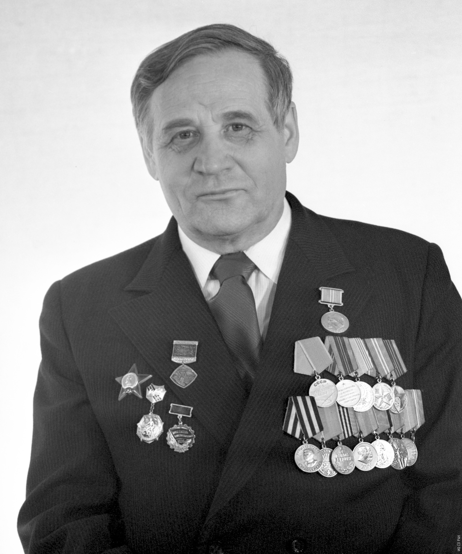 Буркацкий А.М., сотрудник Института физики им. Л.В. Киренского Сибирского отделения Академии наук СССР (ИФ СО АН СССР), участник Великой Отечественной войны (1941-1945 гг.). Фото 9 мая 1985 года. Красноярск.