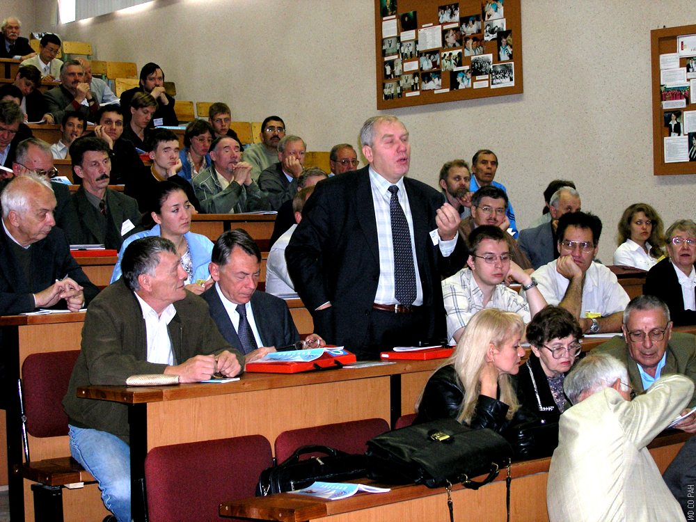 Пленарное заседание участников Евро-Азиатского симпозиума «Прогресс в магнетизме» (EASTMAG-2004), организованного и проведенного в Красноярске в августе 2004 года. Во втором ряду, вторая слева- профессор Эдельман И.С., главный научный сотрудник лаборатории физики магнитных явлений Института физики им. Л.В. Киренского Сибирского отделения Российской академии наук (ИФ СО РАН). Крайний слева, в третьем ряду - В.И. Зиненко, ведущий научный сотрудник лаборатории кристаллофизики ИФ, пятый слева Д.М. Дзебисашвили, старший научный сотрудник лаборатории теоретической физики ИФ. В четвертом ряду, вторая слева Шнейдер Е.И., старший научный сотрудник лаборатории физики магнитных явлений Института физики.