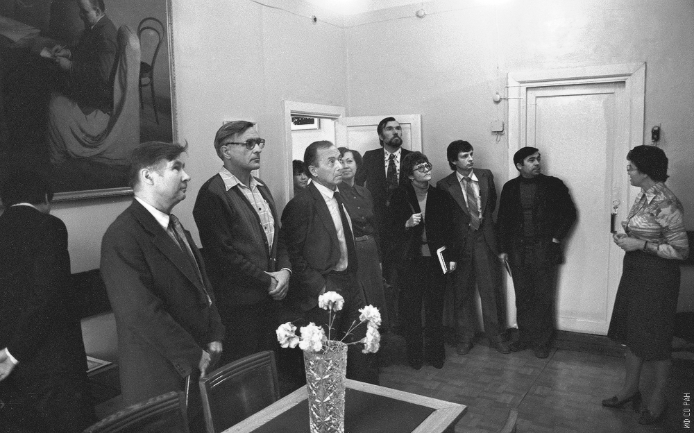 Гости из Томского научного центра в мемориальном музее организатора и первого директора Института физики Сибирского отделения Академии наук СССР академика Леонида Васильевича Киренского. Рассказывает Эдельман И.С. Второй справа Бузник В.М., четвертый справа Чистяков Н.С. Снимок 1982 года. Красноярск.