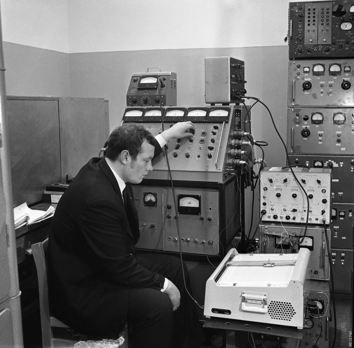 Федоров Юрий Михайлович, младший научный сотрудник лаборатории высокочастотных и импульсных свойств тонких магнитных пленок Института физики им. Л.В. Киренского Сибирского отделения Академии наук СССР (ИФ СО АН СССР), за установкой для исследования взаимодействия света с прозрачными магнитоупорядоченными кристаллами, фото 1972 года. Красноярск.