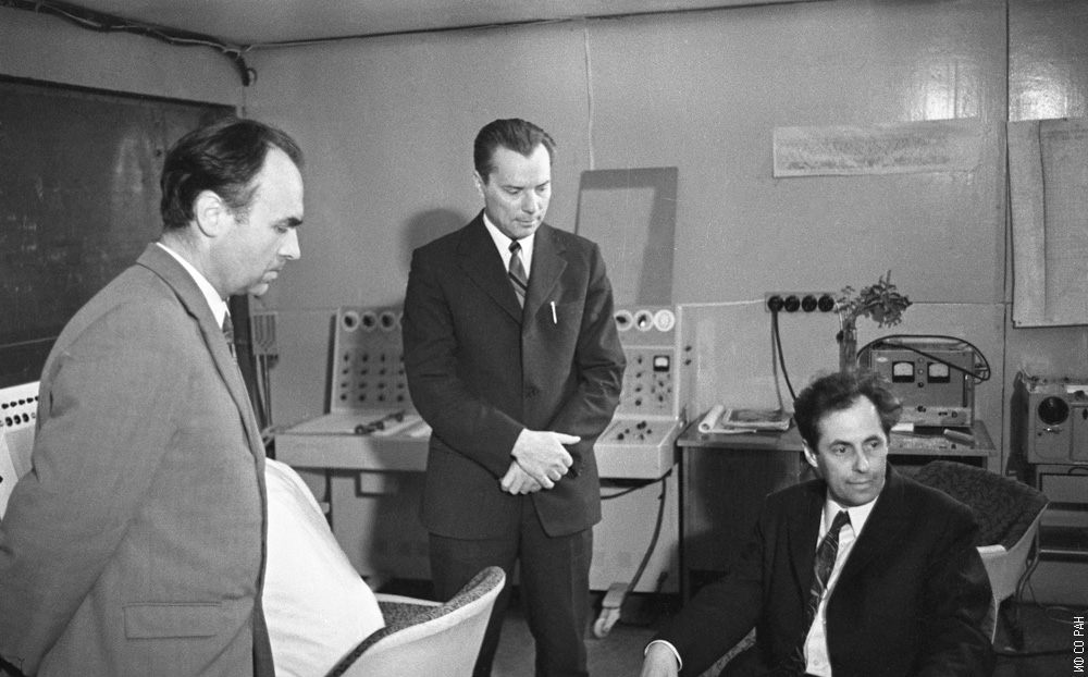 Во время шестимесячного научного эксперимента на установке «БИОС-3» Института физики им. Л.В. Киренского Сибирского отделения Академии наук СССР (ИФ СО АН СССР). Это была космическая программа института. "БИОС-3" представлял собой замкнутую экологическую систему жизнеобеспечения с автономным управлением. У пульта управления установки сотрудники отдела биофизики, слева направо: Лисовский Г.М., Окладников Ю.Н., Гительзон И.И., фото 1973 года. Красноярск.