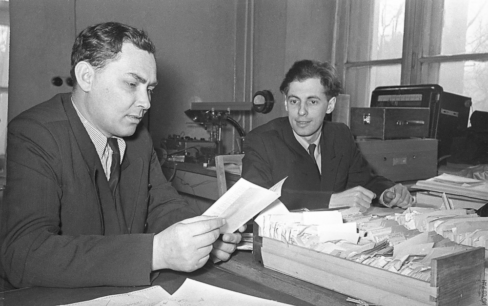 Терсков И. А. (слева), Гительзон И. И., сотрудники Института физики Сибирского отделения Академии наук СССР (ИФ СО АН СССР), за обсуждением результатов эксперимента, фото1963 года. Красноярск.