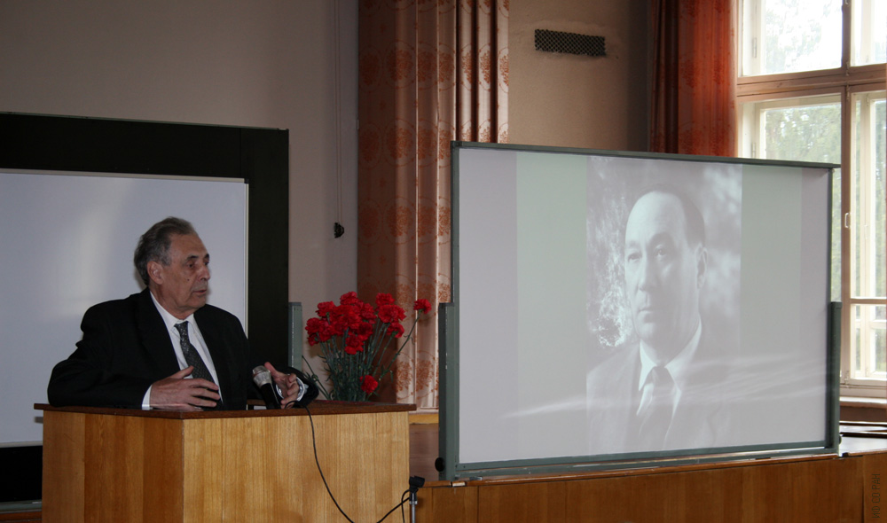 Академик Гительзон И.И выступает с воспоминаниями об академике Киренском Л.В. на торжественном заседании ученого Совета, посвященного 100-летию со дня рождения организатора и первого директора Института физики им. Л.В. Киренского Сибирского отделения Российской академии наук. 9 апреля 2009 года. Красноярск.