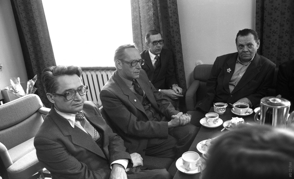 В конференц-зале Института физики им. Л.В. Киренского Сибирского отделения Академии наук СССР на научных чтениях, посвященных памяти академика Л.В. Киренского, организатора и первого директра института. Слева направо: В.А. Игнатченко, И.С.Эдельман, Л.Н. Звегинцева, А.В. Коршунов, С.Ф. Холкин, 8 апреля 1977 года.