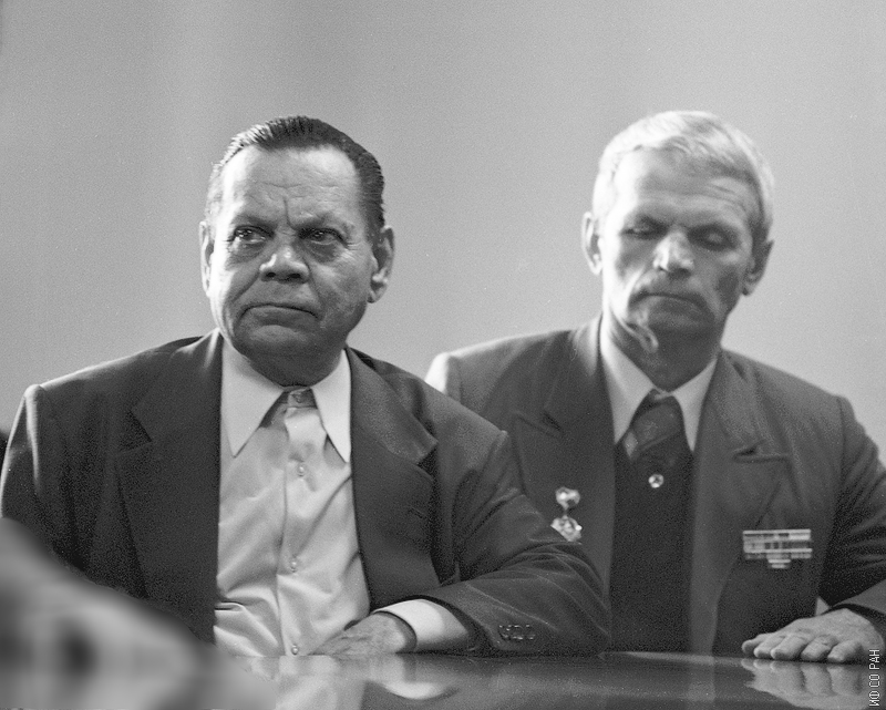 Участники Великой Отечественной войны (1941-1945 гг.) Холкин Савелий Федорович (слева) и Голеусов Александр Денисович, сотрудники Института физики им. Л.В. Киренского Сибирского отделения Академии наук СССР (ИФ СО АН СССР), на торжественном заседании, посвященном Дню Победы, 9 мая 1981 года. Красноярск.