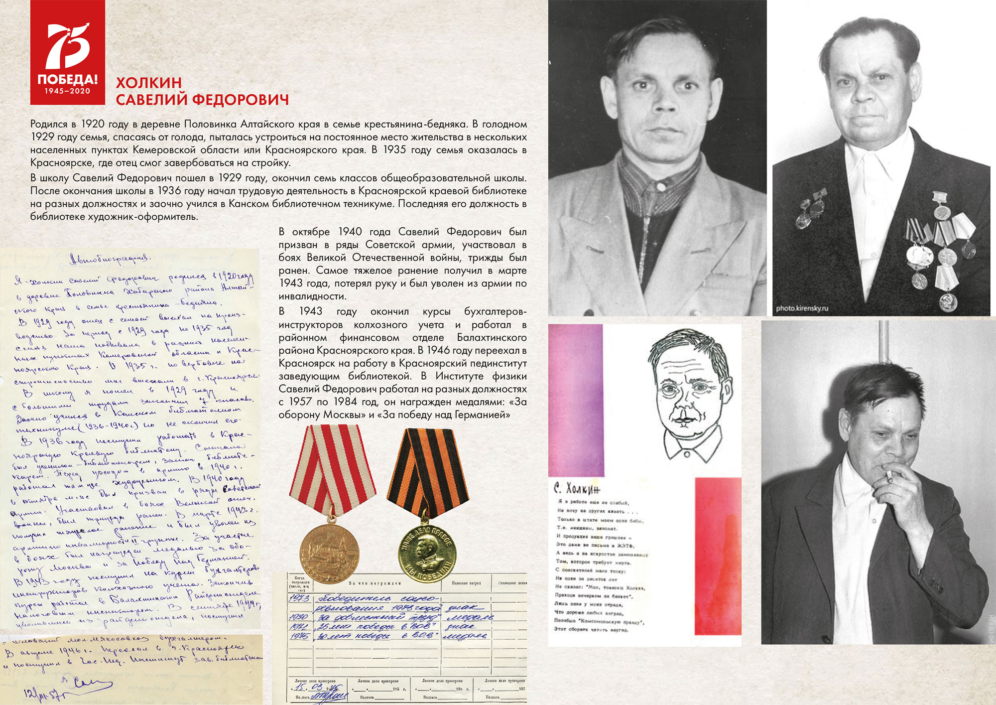 Холкин Савелий Федорович (1920-1990), образование неполное среднее, работал в Институте физики им. Л.В. Киренского Сибирского отделения Академии наук СССР с 1957 по 1983 год, организовал участок оперативной полиграфии в институте и руководил его работой до 1983 года. Участник Великой Отечественной войны 1941-1945 годов..