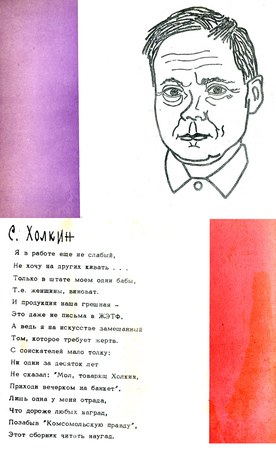 Дружеский шарж Холкина С.Ф. из книги шаржей "Музей друзей", первая часть которой вышла в 1967 году. Авторами ее являются научные сотрудники института О.А. Баюков и Н.С. Чистяков. Книга вышла малым тиражом (всего 100 экземпляров) и моментально разошлась среди персонажей книги, сотрудников и была подарком авторов к юбилею института, 1967 год.