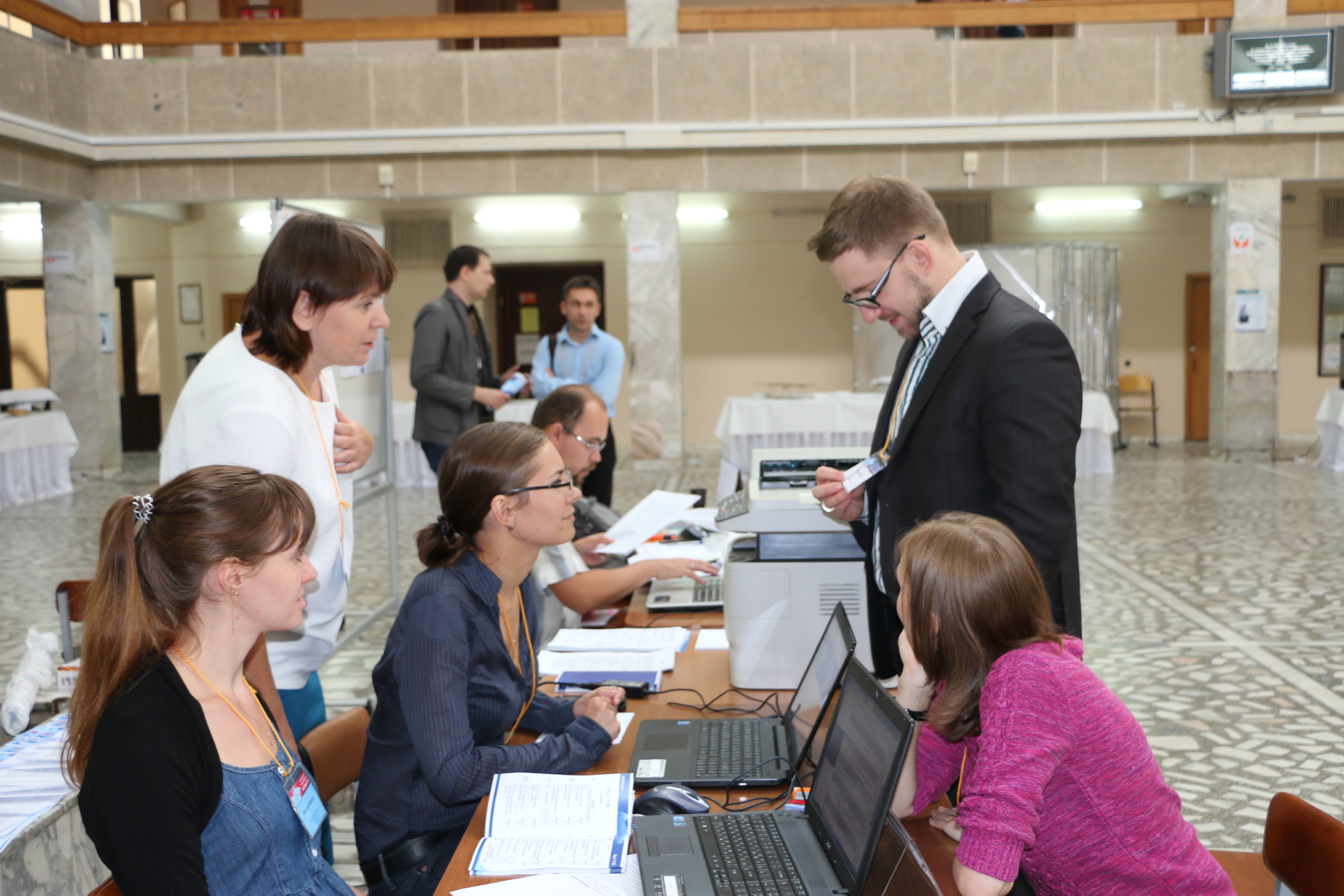 Евгения Мошкина, Оксана Иванова, Наталья Гребенникова и Юлия Самошкина, члены локального комитета Евро-Азиатского симпозиума "Прогресс в магнетизме" (EASTMAG-2016), сотрудники Института физики им. Л.В. Киренского Сибирского отделения Российской академии наук (ИФ СО РАН), организованного и проведенного в Красноярске в августе 2016 года, с представителем компании-спонсора Андреем Омировым. Проходил симпозиум в конгресс-холле Сибирского федерального университета т(СФУ).