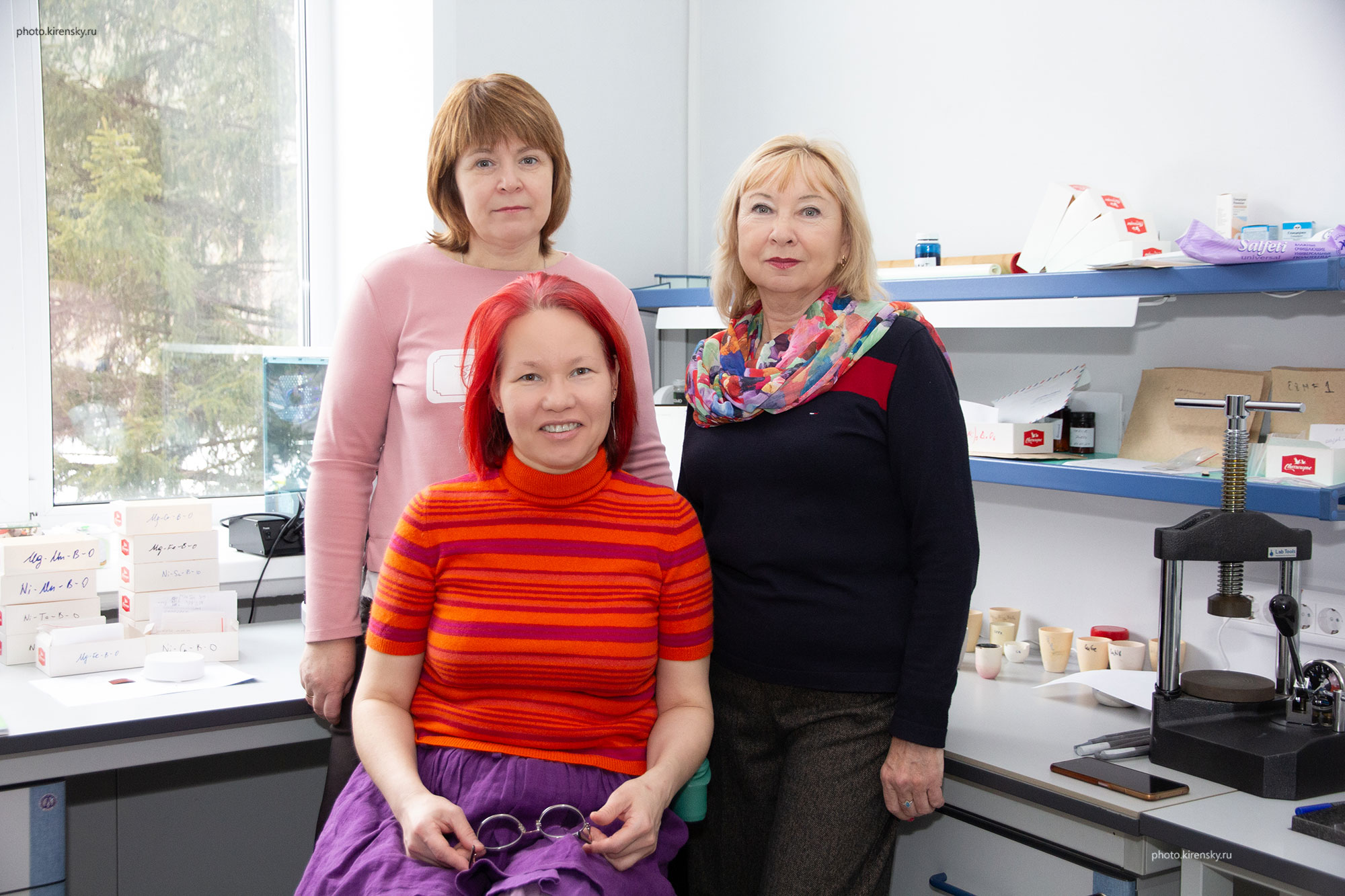 Сотрудники лаборатории физики магнитных явлений Института физики им. Л.В. Киренского Сибирского отделения Российской академии наук, сидит Гохвельд Юлия Сергеевна, младший научный сотрудник; стоят, слева: Иванова Оксана Станиславовна, кандидат физико-математических наук, старший научный сотрудник и лаборант Бруштунова Ольга Николаевна. Фото 6 мая 2025 года