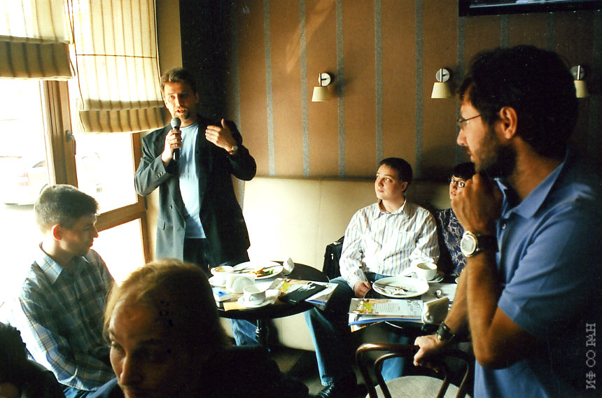 На фото - в научном кафе, слева направо: Д.М. Гохфельд, С.В. Комогорцев, А.В. Изотов, сотрудники Института физики и М. Гуревич, сотрудник Института биофизики СО РАН.
