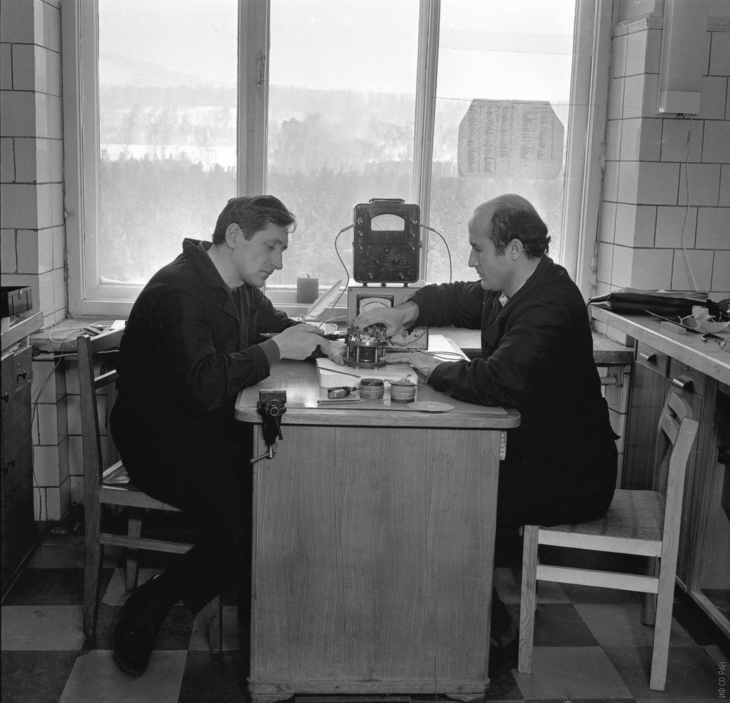 1977 год. Катрухин Юрий Константинович (слева) и Каневский Марк Юльевич за сборкой одного из первых клееных соленоидов, разработанных в лаборатории сильных магнитных полей Института физики им. Л.В. Киренского Сибирского отделения Академии наук СССР (ИФ СО АН СССР). Красноярск.