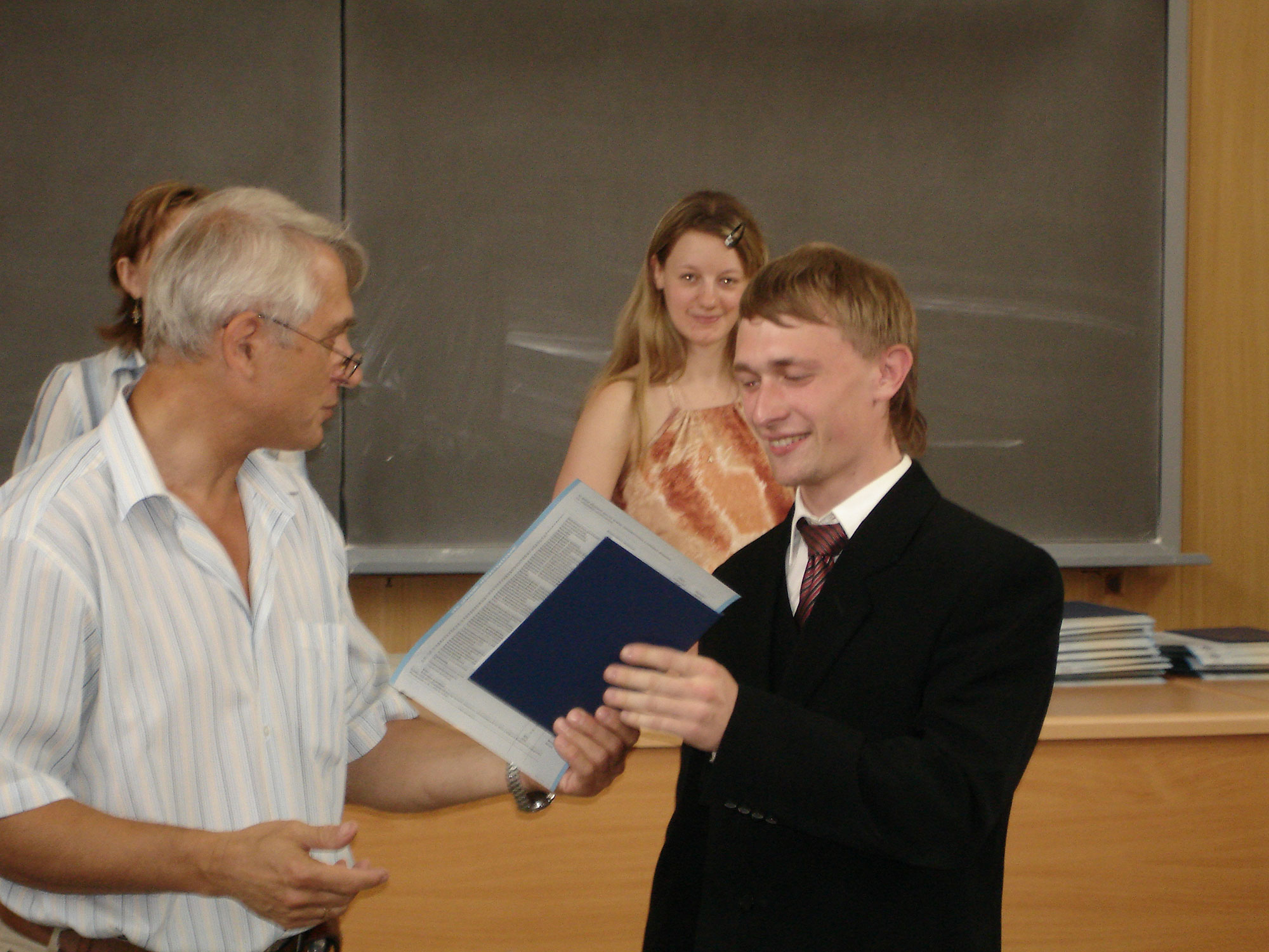 2007 год. Кобяков Александр Васильевич (справа). Вручение диплома об окончании Сибирского федерального университета. Диплом вручает профессор д.ф.м.н. Баранов А.