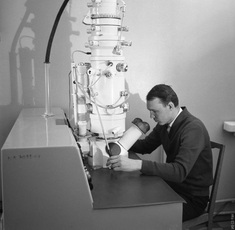 1970 год. Комалов А. С., сотрудник лаборатории магнитных монокристаллических пленок Института физики Сибирского отделения Академии наук СССР (ИФ СО АН СССР), за исследованием доменной структуры тонких магнитных пленок на электронном микроскопе УЭМВ-100. В этом году он защитил диссертацию на соискание ученой степени кандидата физико-математических наук. Красноярск.