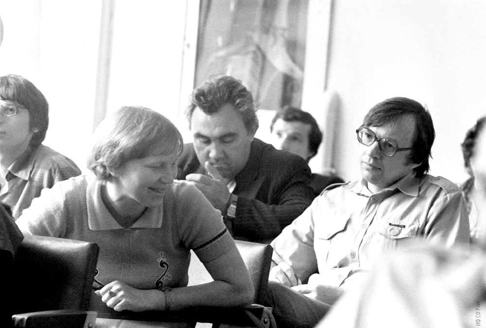 В конференц-зале Института физики им. Л.В. Киренского Сибирского отделения Академии наук СССР (ИФ СО АН СССР) на защите докторской диссертации Овчинникова С.Г. Слева направо: Татьяна Павловна Сандалова, Владимир Павлович Кононов , Пётр Иванович Белобров в 1984 году. Красноярск.