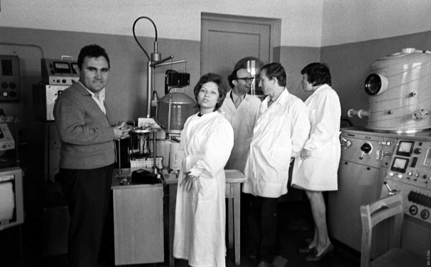 Сотрудники лаборатории высокочастотных и импульсных свойств тонких магнитных пленок Института физики им. Л.В. Киренского Сибирского отделения Академии наук СССР (ИФ СО АН СССР), слева направо: Кононов В.П., Буркова Л.В., Щербаков В.М., Жигалов В.С., ?, в зале для напыления магнитных пленок, Снимок 1972 года. Красноярск.