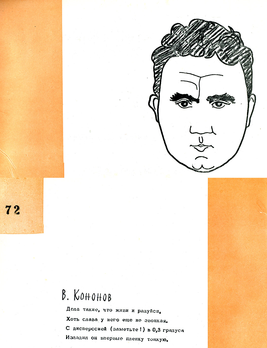 Дружеский шарж Кононова В.П. из книги "Музей друзей", изданной научными сотрудниками Института физики Сибирского отделения Академии наук СССР (ИФ СО АН СССР) Олегом Артемьевичем Баюковым и Николаем Сергеевичем Чистяковым. Удивительная книжка дружеских шаржей и эпиграмм на сотрудников Института физики СО АН СССР. Она вышла в 1967 году к 10-летию начала работы института. Вышла небольшим тиражом в 100 экземпляров и распространялась строго по списку, лично в руки. Узнать себя на страницах книги смогли 48 самых ярких и заметных личностей молодого института. Позже (в 1971 году) вышла вторая книга под таким же названием. Что побудило их взяться за такой труд, авторы подробно изложили в предисловии к первой и второй книгам. Книги размещены на сайте.