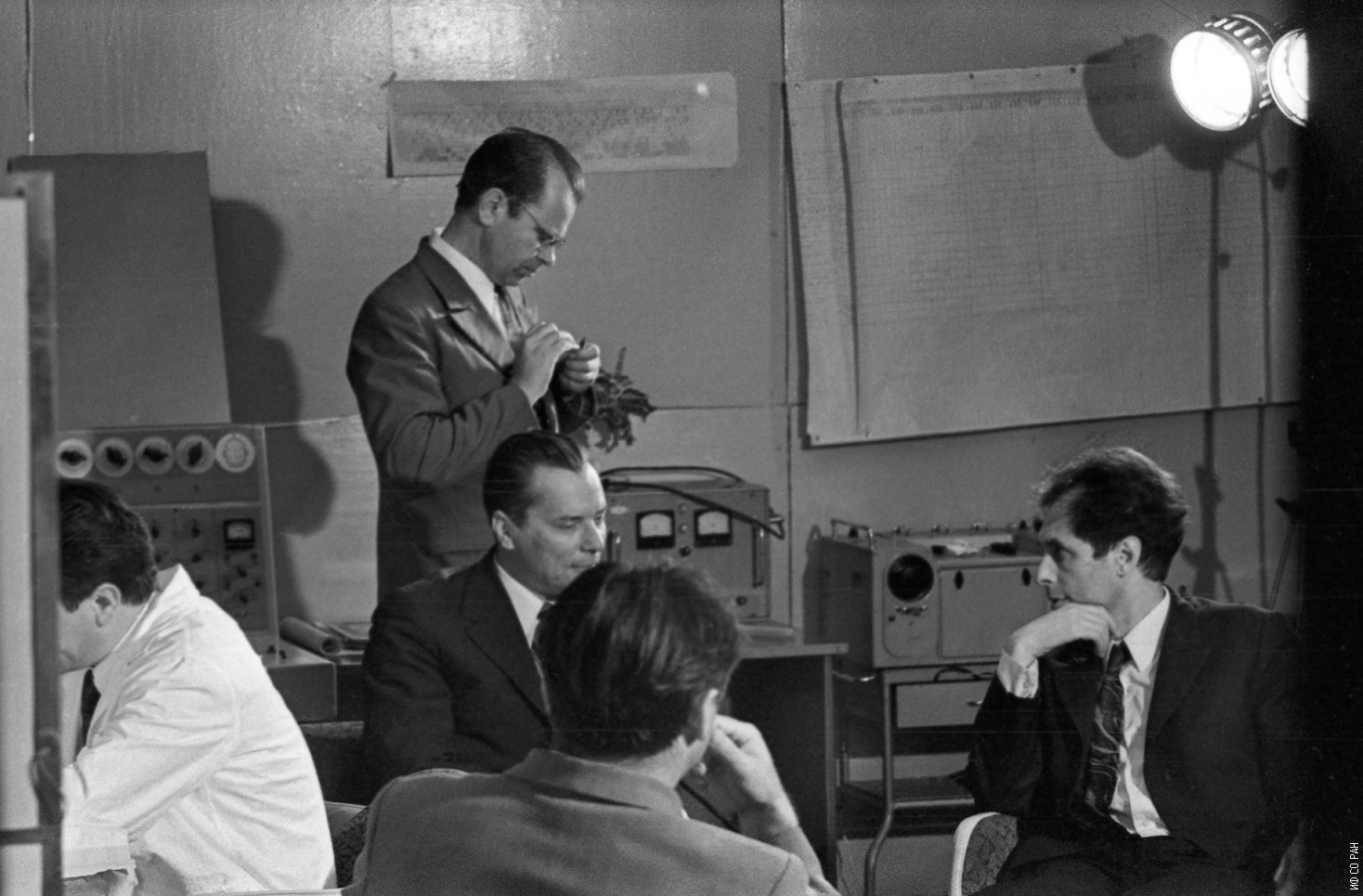 1973 год.Руководители эксперимента «БИОС-3" Института физики им. Л.В. Киренского Сибирского отделения Академии наук СССР (ИФ СО АН СССР) за обсуждением хода эксперимента. Стоит Ковров Б.Г., сидит, в центре Окладников Ю.Н. и справа Гительзон И.И. Красноярск.