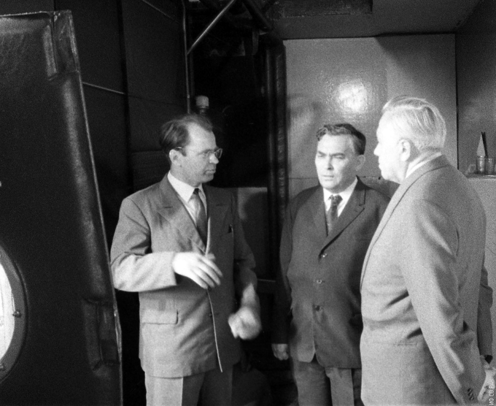 1973 год. Б.Г. Ковров (слева), заведующий лабораторией модулирования и конструирования замкнутых систем Института физики им. Л.В. Киренского Сибирского отделения Академии наук СССР (ИФ СО АН СССР), И.А. Терсков, директор института и академик В.П. Бармин, участник III-его Всесоюзного совещания по управляемому биосинтезу и биофизике популяций, организованного и проведенного отделом биофизики института в Красноярске, у установки «БИОС-3». Красноярск.