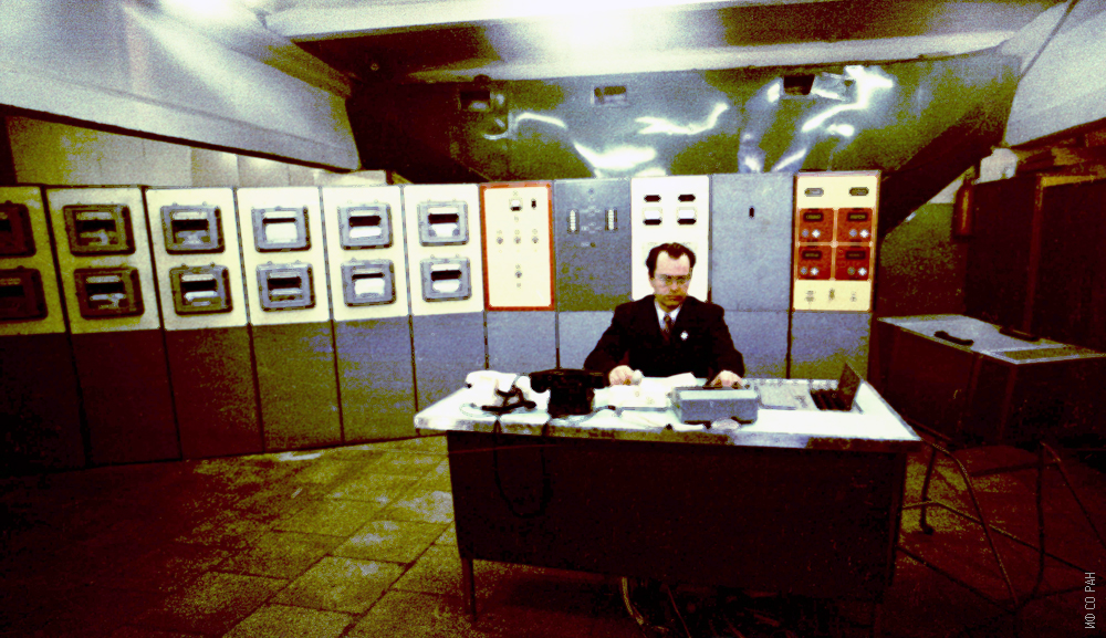 Ковров Борис Григорьевич, заведующий лабораторией моделирования и конструирования замкнутых систем Института физики им. Л.В. Киренского Сибирского отделения Академии наук СССР (ИФ СО АН СССР) за пультом управления биологическими и медицинскими параметрами экспериментальной установки «БИОС-3», представляющей собой замкнутую экологическую систему с автономным управлением. Проходил эксперимент по замыканию массообмена, включая человека, Фото 1973 года. Красноярск.