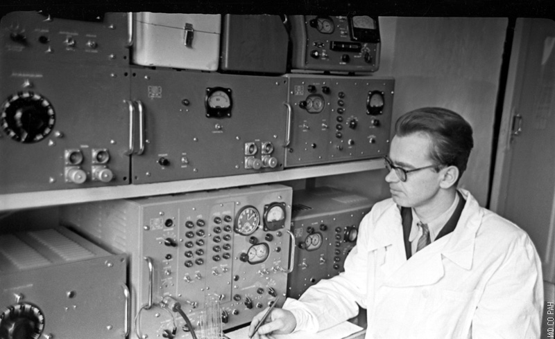 1965 год. На снимке Ковров Б.Г., старший научный сотрудник Института физики Сибирского отделения Академии наук СССР (ИФ СО АН СССР). Конструкторы- механики отдела биофизики под руководством Бориса Григорьевича разрабатывали культиваторы для длительного непрерывного культивирования микроводоросли хлореллы. Различные емкости культиваторов, толщины слоя суспензии, мощность ламп, светоприемные поверхности позволяли применять их для накопления биомассы, изучения процесса фотосинтеза и создания замкнутой по газу системы «человек-микроводоросли». Ковров у пульта управления одного из культиваторов. Красноярск.