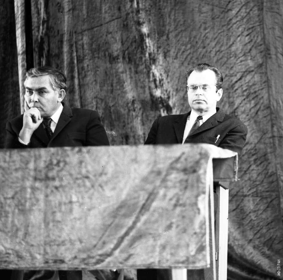 Терсков И.А. (слева), директор Института физики им. Л.В. Киренского Сибирского отделения Академии наук СССР (ИФ СО АН СССР) и Ковров Б.Г., заведующий лабораторией моделирования замкнутых систем Института физики, в президиуме заседания, посвященного памяти академика Л. В. Киренского, организатора и первого директора института. 7 апреля 1974 года. Красноярск.