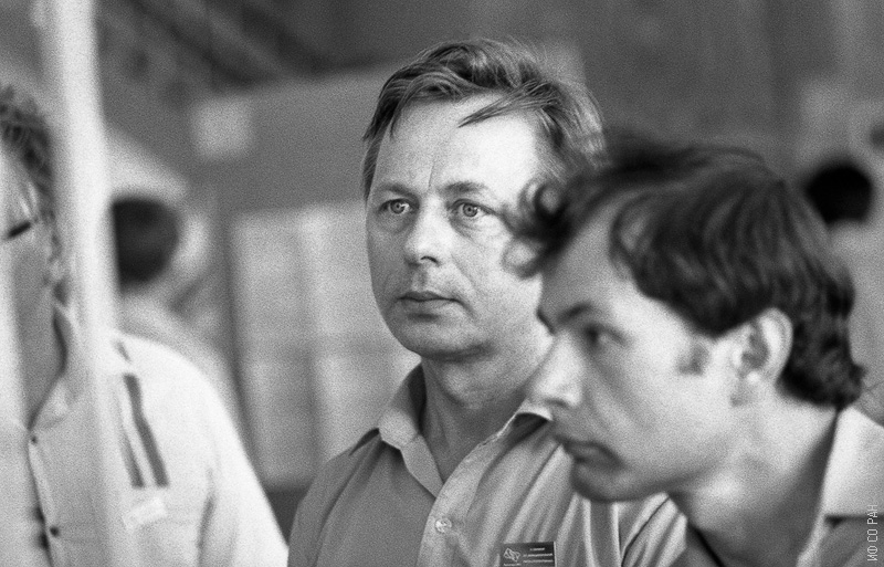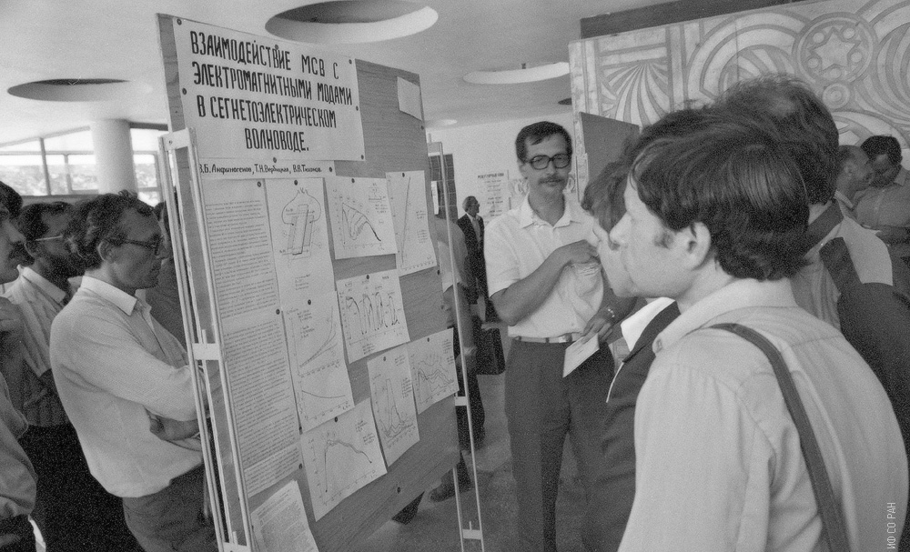 Петроковский Герман Антонович (слева), заведующий лабраторией резонансных свойств магнитоупорядоченных веществ и Красиков Владимир Сергеевич, научный сотрудник лаборатории кристаллофизики Института физики им. Л.В. Киренского Сибирского отделения Академии наук СССР (ИФ СО АН СССР), у стендовых докладов на конференции по функциональной магниоэлектронике в Дивногорске (Красноярский край) в 1986 году.