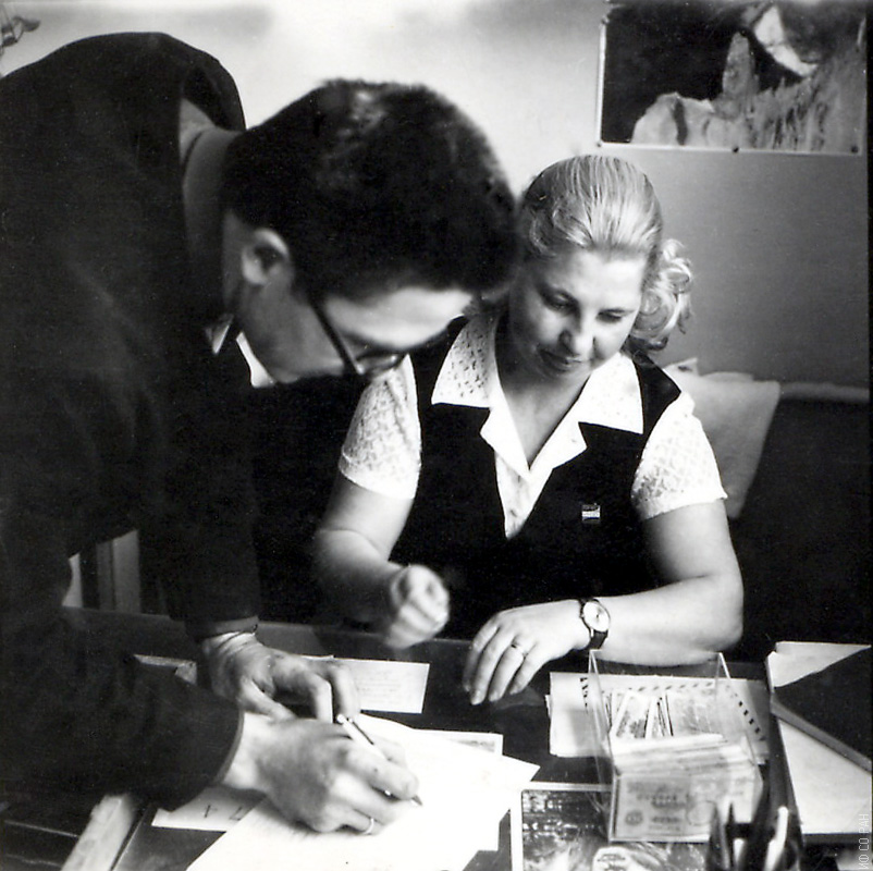 1974 год. Сотрудники лаборатории кристаллофизики Института физики им. Л.В. Киренского Сибирского отделения Академии наук СССР (ИФ СО АН СССР) в день зарплаты. Чанчикова Н.С. материально-ответственная лаборатории выдает зарплату, Крупный А.И. её получает.