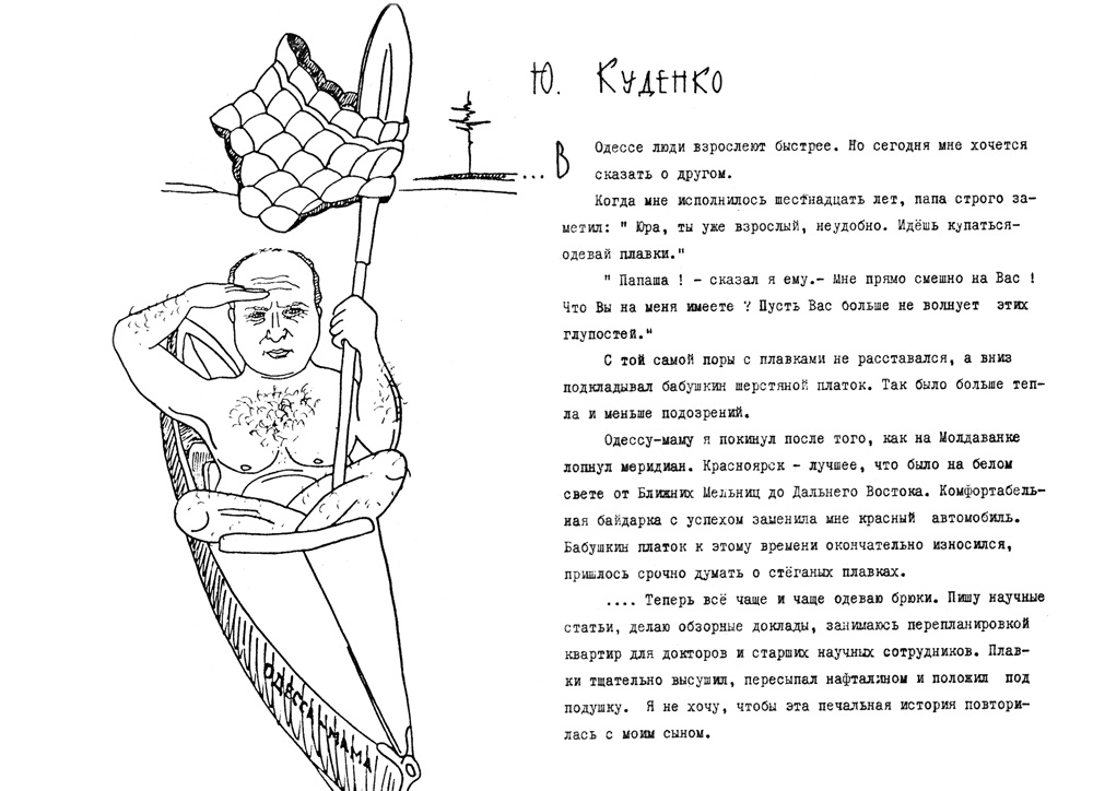 Дружеский шарж Куденко Ю.А. из книги шаржей "Музей друзей", первая часть которой вышла в 1967 году. Авторами ее являются научные сотрудники института О.А. Баюков и Н.С. Чистяков. Книга вышла малым тиражом (всего 100 экземпляров) и моментально разошлась среди персонажей книги, сотрудников и была подарком авторов к юбилею института, 1967 год.