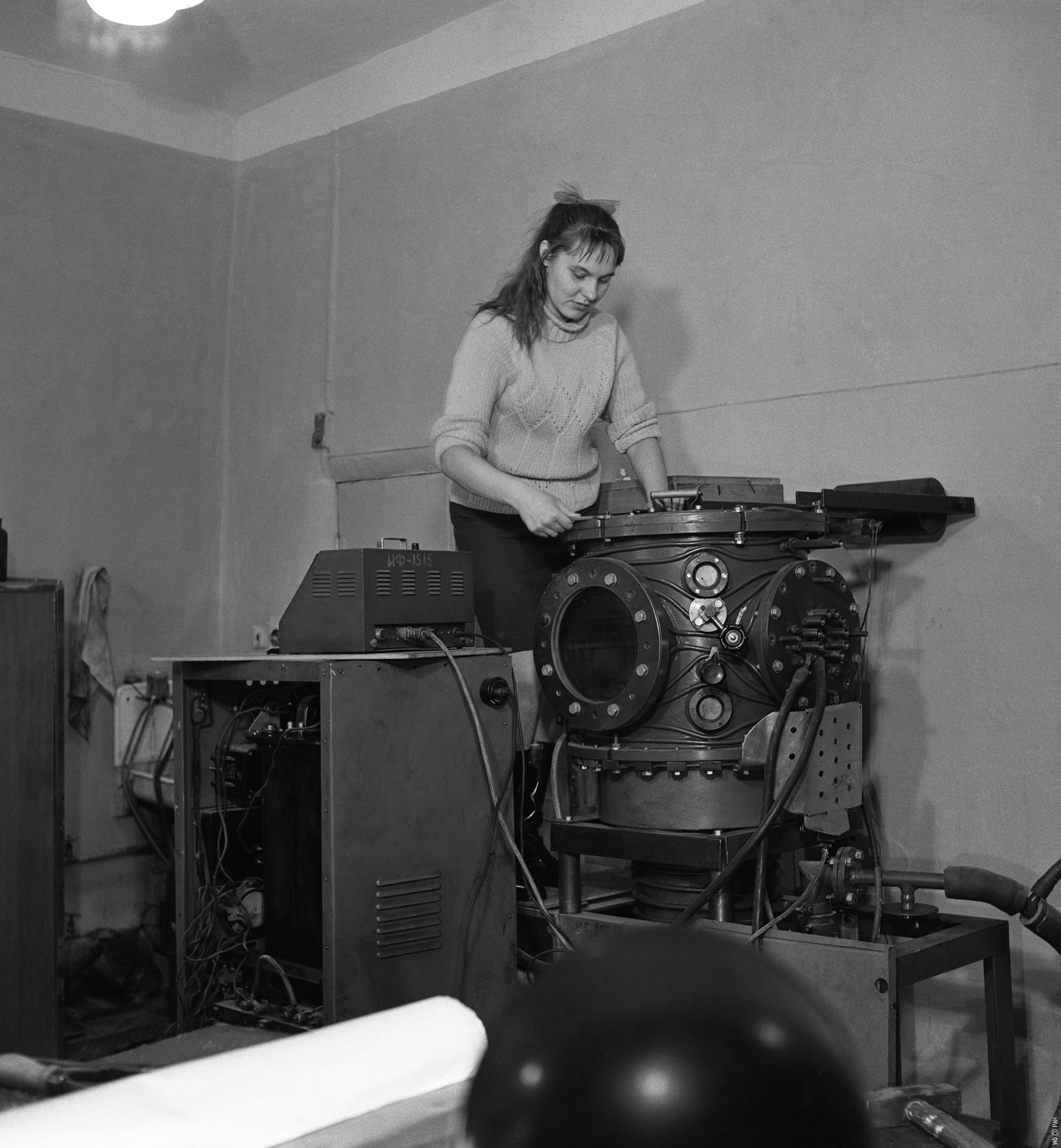 Квеглис Л.И., сотрудник Института физики им. Л.В. Киренского Сибирского отделения Академии наук СССР (ИФ СО АН СССР), за работой на электронном микроскопе. Снимок 1985 года.