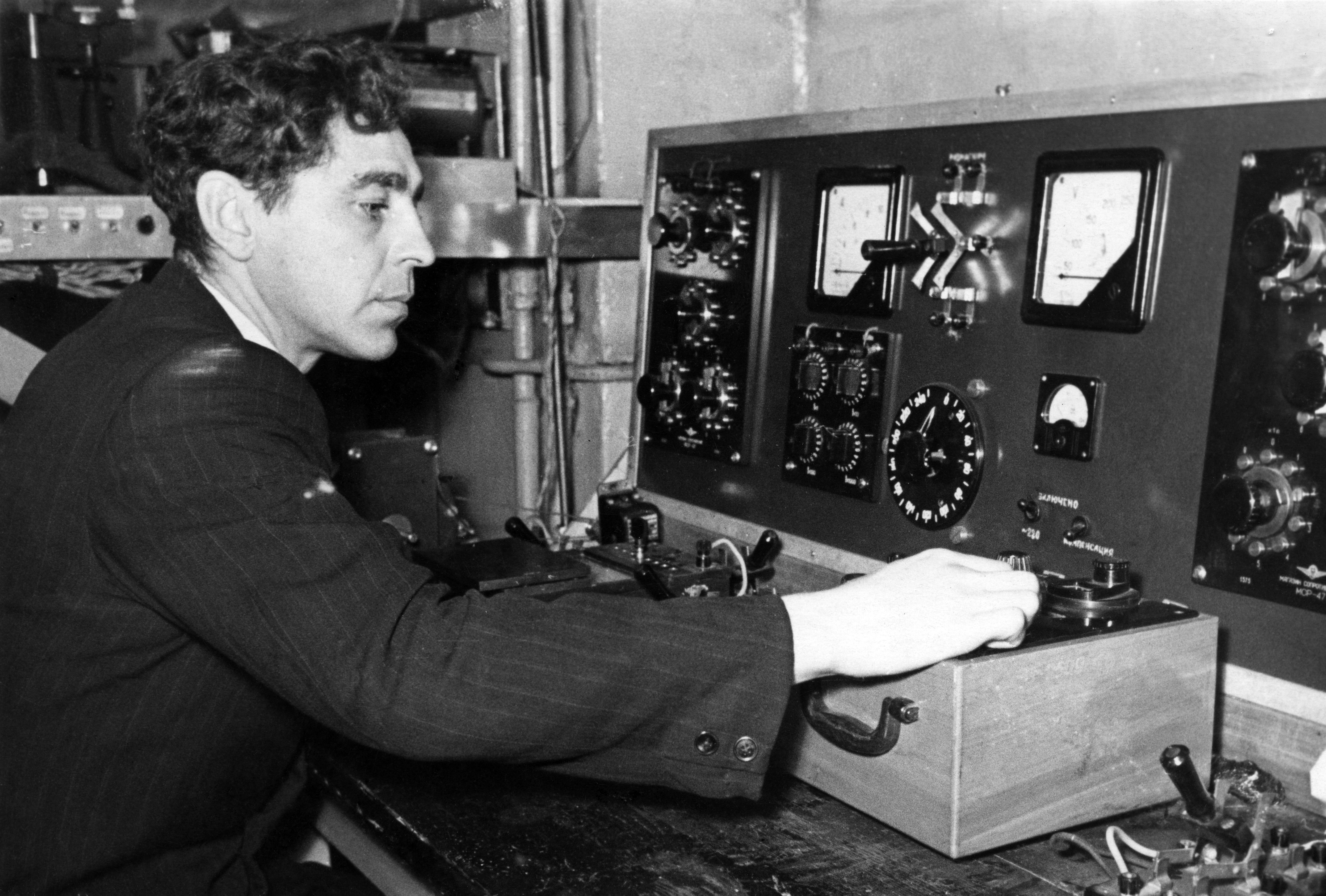 (ИФ СО АН СССР), за пультом управления вертикальным астатическим магнетометром для исследования температурного гистерезиса намагниченности ферритов, фото 1962 года. Красноярск.