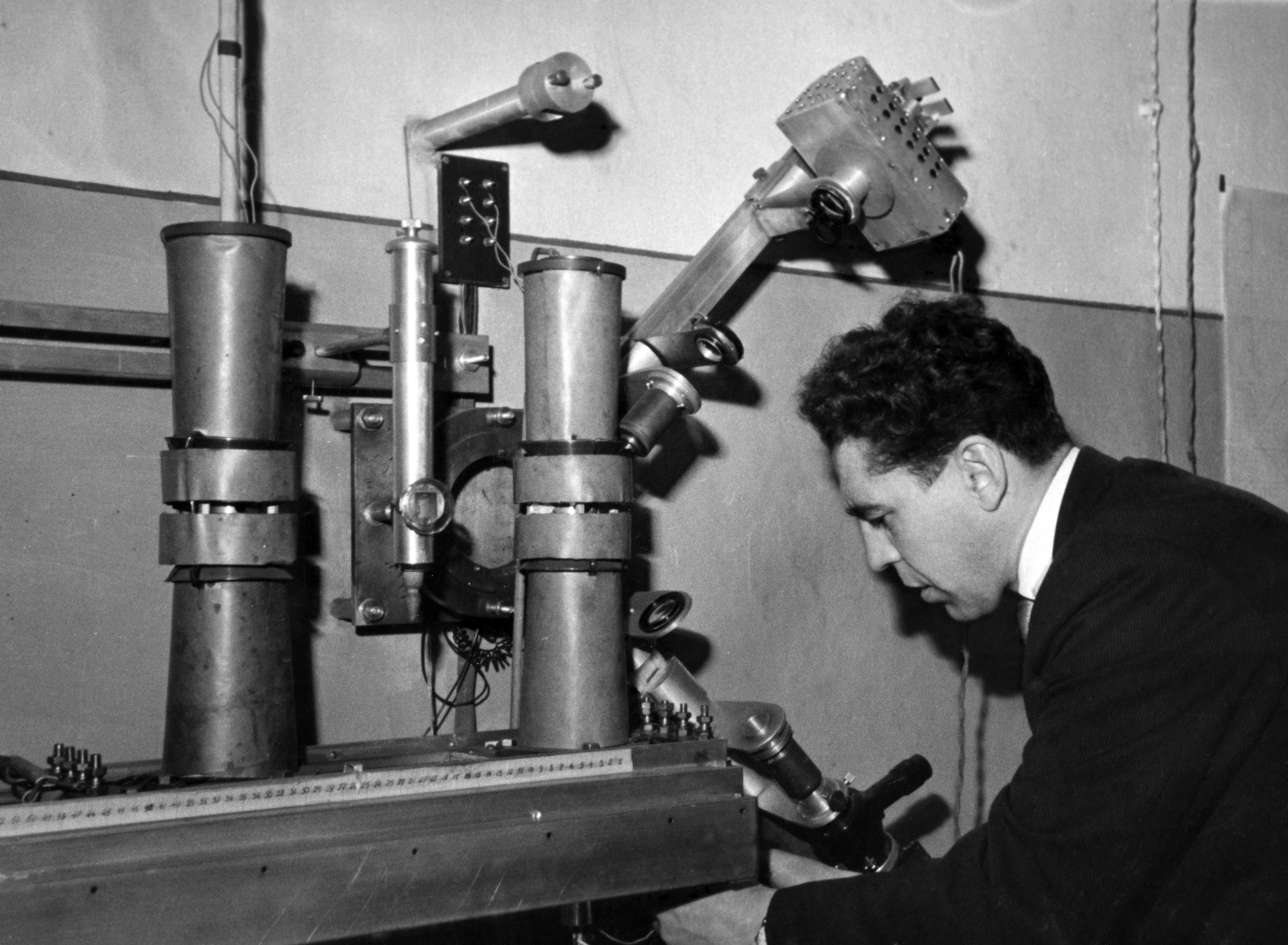 Лаптей Д.А., старший научный сотрудник лаборатории физики магнитных явлений Института физики Сибирского отделения Академии наук СССР (ИФ СО АН СССР), за установкой по изучению динамики доменной структуры эффектом Керра, фото 1962 года.