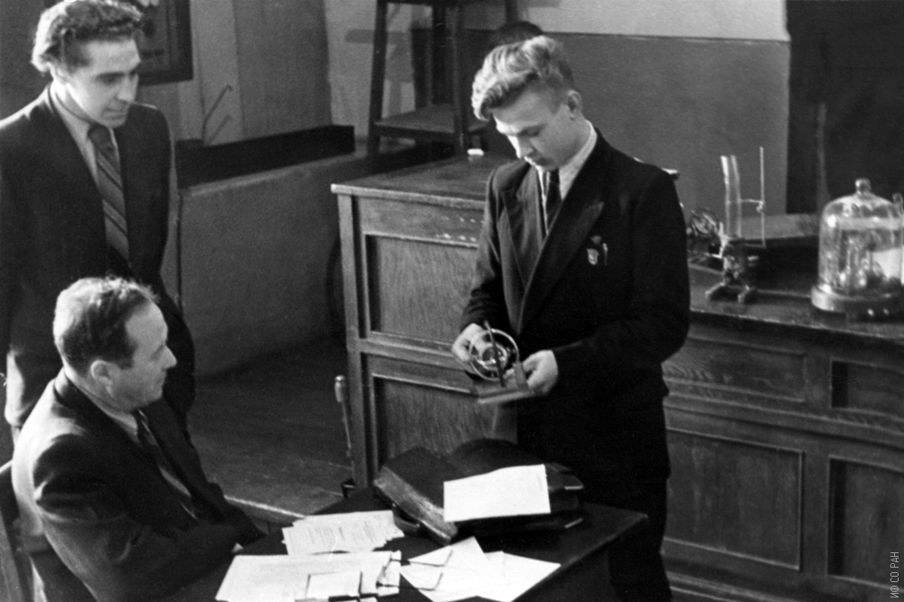 1959 год. На снимке первые сотрудники лаборатории физики магнитных явлений Института физики Сибирского отделения Академии наук СССР (ИФ СО АН СССР). Слева направо: Лаптей Д.А., Савченко М.К., Черкашин В.С. Красноярск.