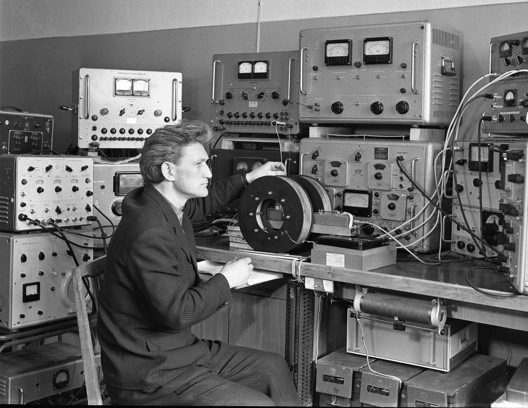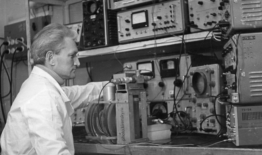 Мальцев В.К., инженер лаборатории высокочастотных и импульсных свойств тонких магнитных пленок Института физики им. Л.В. Киренского Сибирского отделения Академии наук СССР (ИФ СО АН СССР), за работой на установке по исследованию явления ядерного магнитного резонанса в тонких магнитных пленках. Красноярск. 1972 год.
