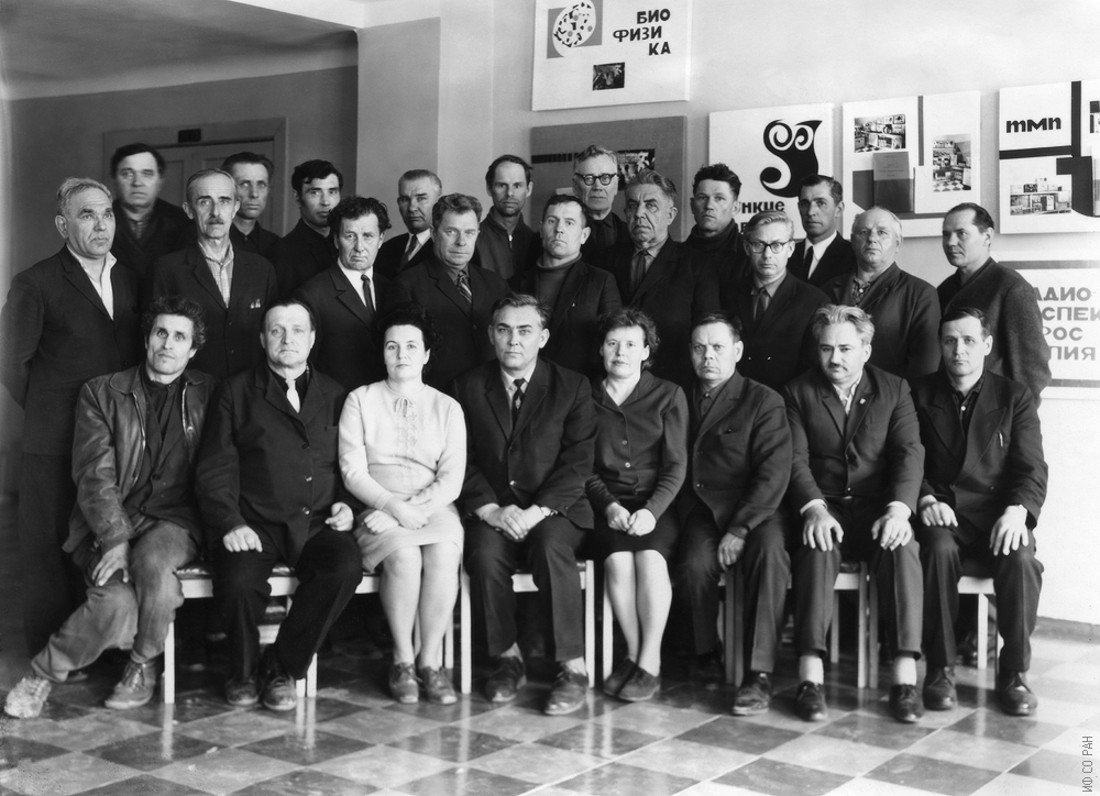 Участники Великой Отечественной войны (1941-1945 гг.) и ветераны Института физики им. Л.В. Киренского Сибирского отделения Академии наук СССР. Сидят (слева направо): ?, Мейер П.И., Гомзякова Н. В., Терсков И.А, Смолянинова А.П., Холкин С.Ф., Ершов Р.Е., Буркацкий А.М.. Во втором ряду (слева направо): Ростовцев П.Г., Николайчук Л.П., Инешин П.М., Зарубин В.С., Еремин А.А., Одинцов А.И., Сидько Ф.Я., ?, Мартоник В.Д. В третьем ряду (слева направо): Чистяков М.С., Близняков В.С., Шаталов А.Ф., Бородин А.Г., Юдин А.Л., ?, ?, Кушнаренко В.А., фото 1972 года. Красноярск.