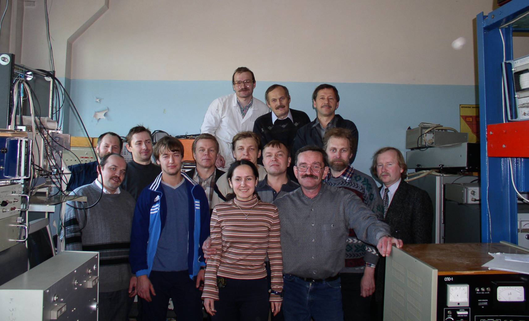 2003 год. Фото на память. Сотрудники лаборатории молекулярной спектроскопии Института физики им. Л.В. Киренского Сибирского отделения Российской академии наук (ИФ СО РАН) после воскресника в лаборатории. В первом ряду (слева направо): Сморгон С.Л., студент КГУ Чебунин Р., Маркевич Е.А., Жуйков В.А. Во втором ряду (слева направо): Назаров В., Шабанов А.В., Зырянов В.Я., Агеев А.Г., Герасимов В.П., Александровский А.С., Втюрин А.Н. В третьем ряду (слева направо): Крылов А.С., Мысливец С.А., Гуняков В.А. Красноярск.