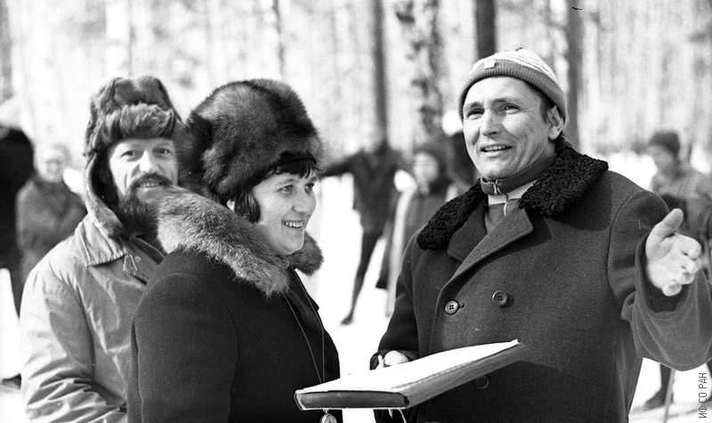 В Академгородке Красноярска праздник. В березовой роще городка провожали масленицу. Организаторы праздника, сотрудники Института физики им. Л.В. Киренского Сибирского отделения Академии наук СССР (ИФ СО АН СССР) (слева направо): Крапивинский М.В., Харченко Г.Г., Некрасов В.А., фото 1974 года.