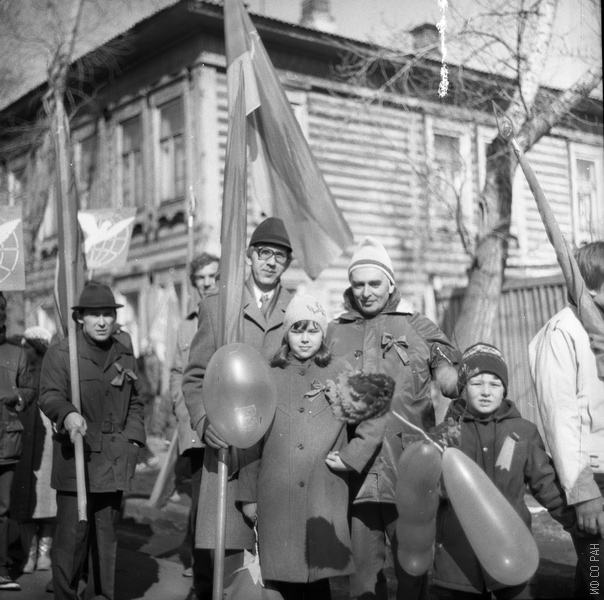 На первомайской демонстрации трудящихся Красноярска 1987 года в колонне Института физики им. Л.В. Киренского Сибирского отделения Акаемии наук СССР (ИФ СО АН СССР). На переднем плане: Овчинников С.Г (слева, с дочерью Натальей) и Айзенберг Л.А., с сыном Женей, сотрудники института.