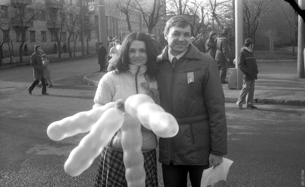 Панкрац Анатолий Иванович, старший научный сотрудник лаборатории резонансных свойств магнитоупорядоченных веществ Института физики им. Л.В. Киренского Сибирского отделения Академии наук СССР (ИФ СО АН СССР), с супругой Ларисой Константиновной на первомайской демонстрации трудящихся Красноярска в 1982 году.
