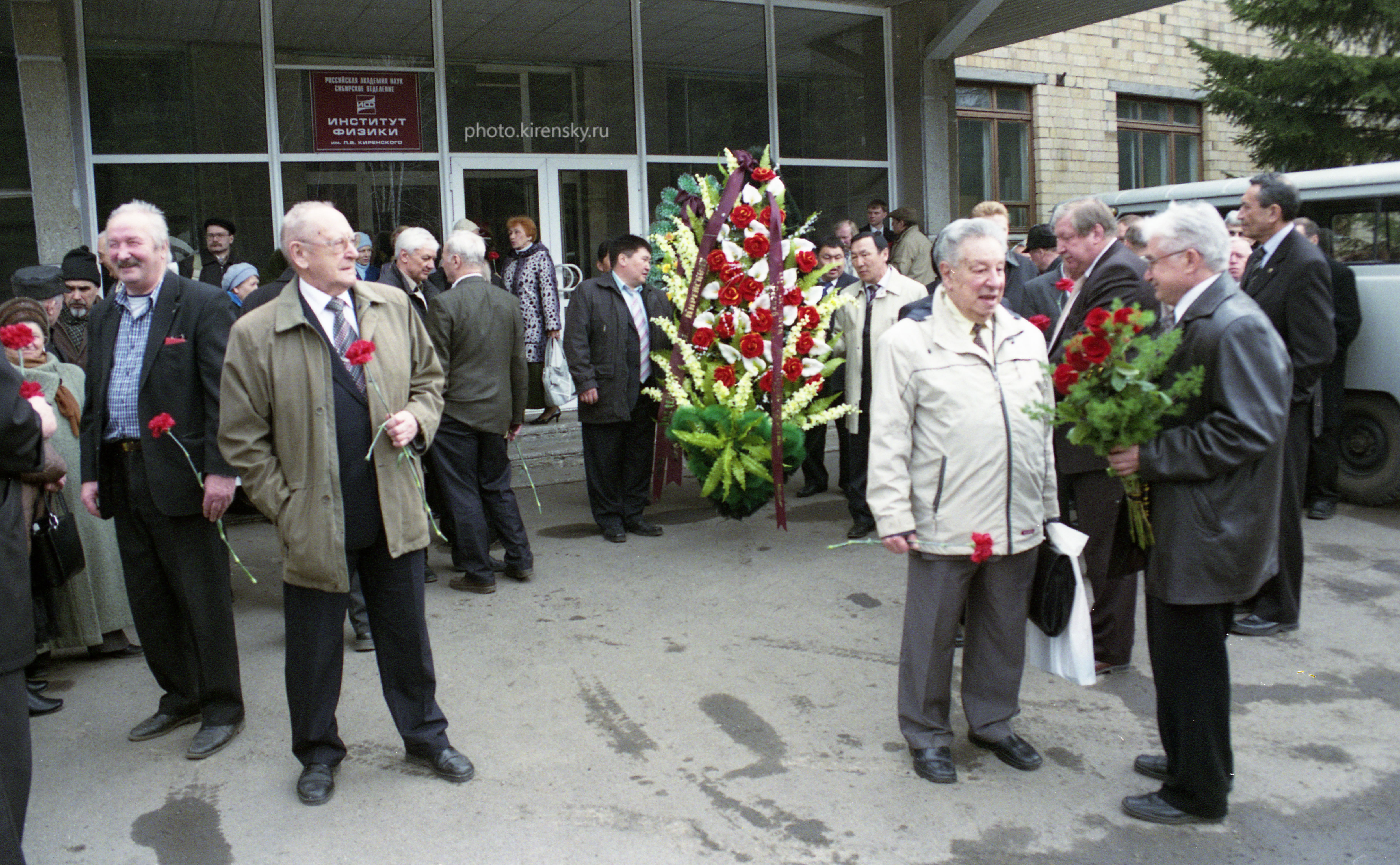 9 апреля 2009 года в Институте физики им. Л.В. Киренского Сибирского отделения Российской академии наук (ИФ СО РАН) торжественно отметили 100 лет со дня рождения основателя и первого директора института Леонида Васильевича Киренского. На снимке момент подготовки к возложению цветов и венков на могилу Леонида Васильевича. Он похоронен на территории Института физики в Академгородке Красноярска. В левом углу снимка: Бондаренко Г.В. и Александров К.С. (справа). В правом углу: Лундин А.Г. и Шабанов В.Ф. (крайний справа).