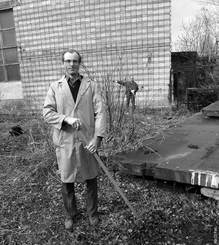 Паршин Александр Михайлович, старший научный сотрудник лаборатории сильных магнитных полей Института физики им. Л.В. Киренского Сибирского отделения Российской академии наук (ИФ СО РАН), во время общеинститутского субботника по уборке территории института, фото 2004 года. Красноярск.