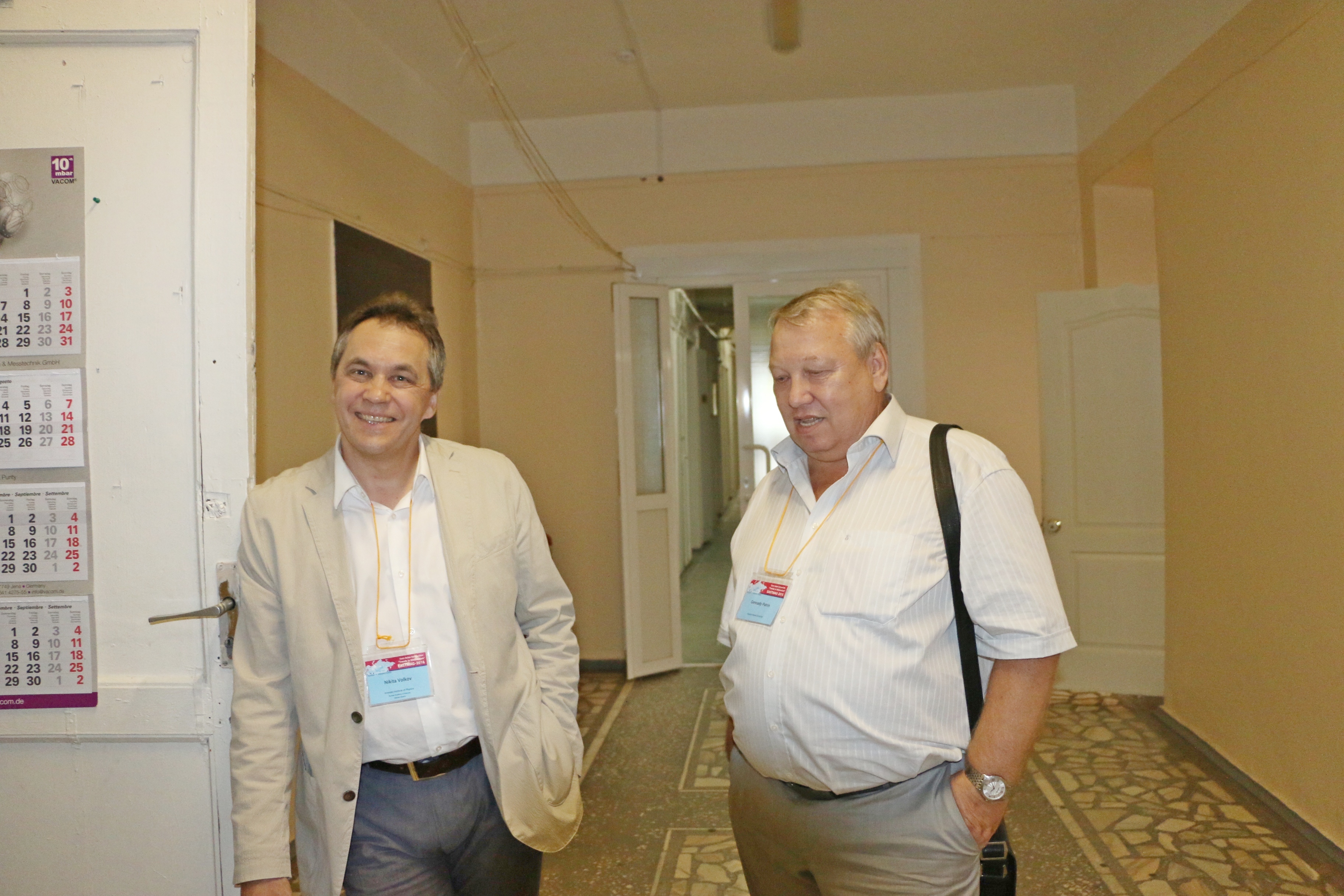 16 августа 2016 года. На Евро-Азиатском симпозиуме "Прогресс в магнетизме" (EASTMAG-2016), организованном и проведенном в Красноярске в конгресс-холле Сибирского федерального университета (СФУ), заведующий лабораторией магнитодинамики Института физики им. Л.В. Киренского Сибирского отделения Российской академии наук (ИФ СО РАН), председатель локального Организационного комитета симпозиума ГЕННАДИЙ СЕМЕНОВИЧ ПАТРИН (справа) и директор Института физики, председатель Организационного комитета симпозиума НИКИТА ВАЛЕНТИНОВИЧ ВОЛКОВ. Красноярск.