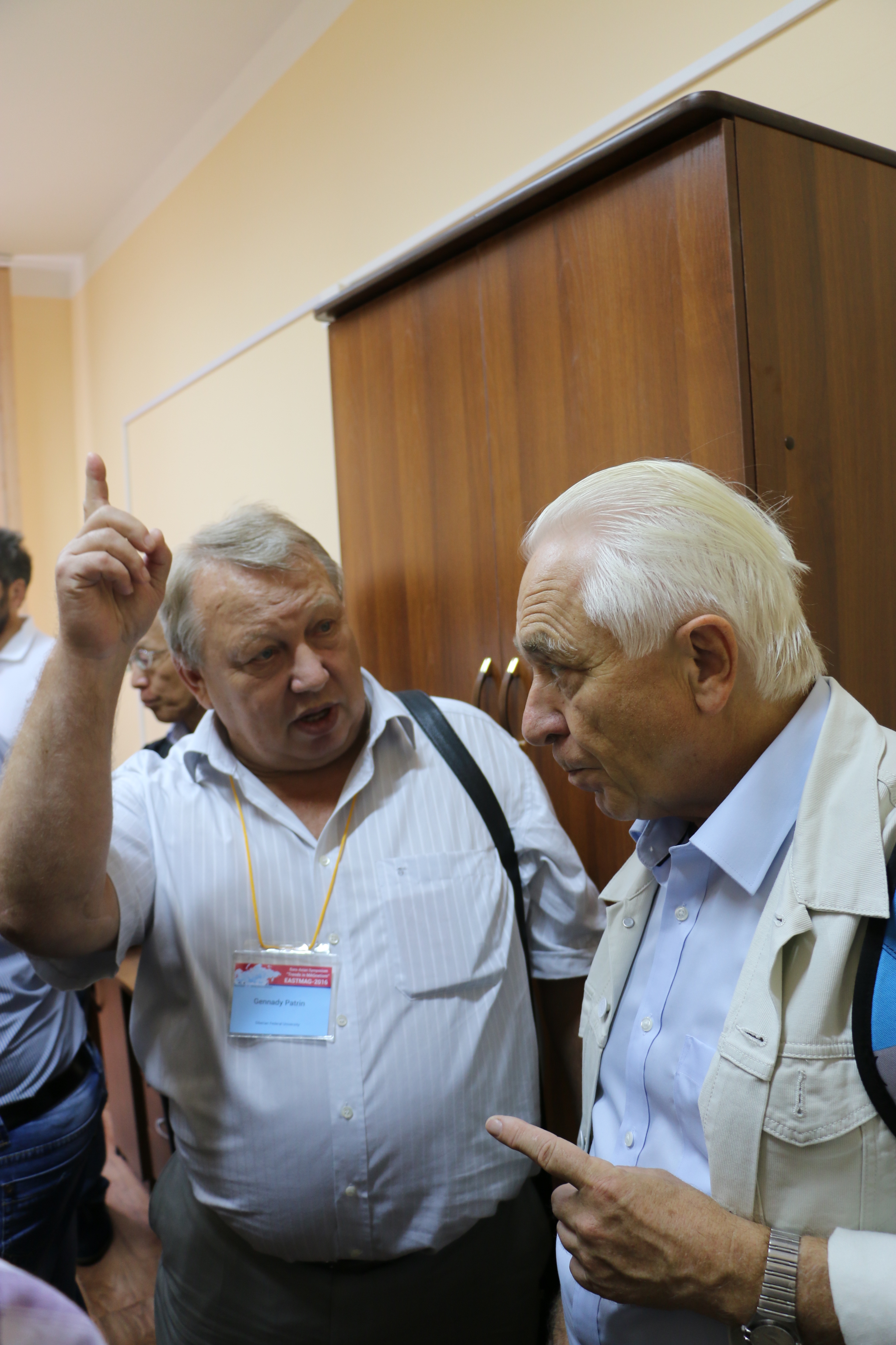 16 августа 2016 года. На Евро-Азиатском симпозиуме "Прогресс в магнетизме" (EASTMAG-2016), организованном и проведенном Институтом физики им. Л.В. Киренского Сибирского отделения Российской академии наук (ИФ СО РАН) в Красноярске, сотрудники института Геннадий Семенович Патрин (слева), заведующий лабораторией магнитодинамики и учёный секретарь института Сергеей Иванович Попков.