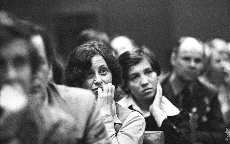 Петраковская Э.А. (слева) и Попова Н.И., сотрудники Института физики им. Л.В. Киренского Сибирского отделения Академии наук СССР (ИФ СО АН СССР), на одном из методологических семинаров в конференц-зале института. Фото 1974 года. Красноярск.